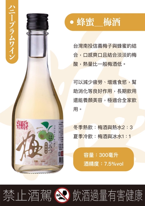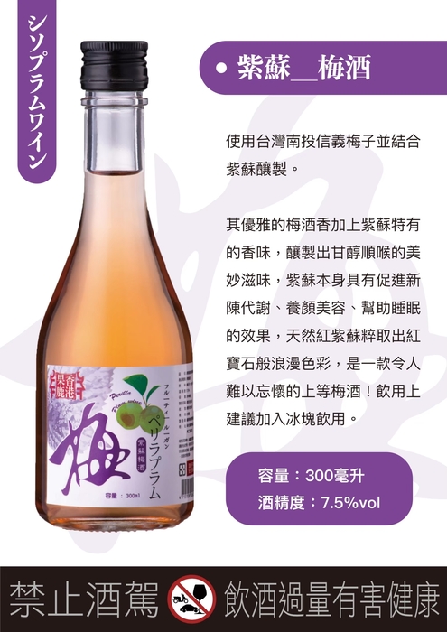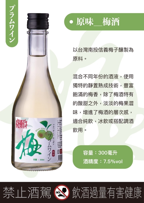 入口滑順、酒體清爽、酸甜平衡。夏季適合冰鎮;冬季宜溫熱享用,加入汽水、果汁、搭配調酒更有層次,絕對是會想與朋友分享的梅酒!